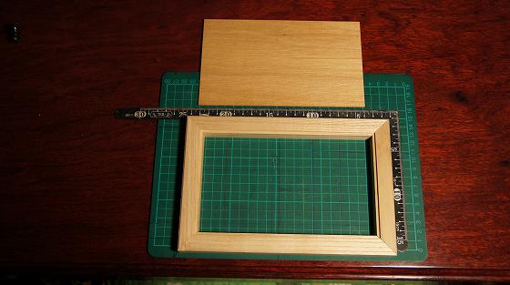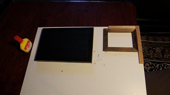 飾り台を直角に合わせ糊付けする、その上に板をはめ込み固定し黒色を塗る。
